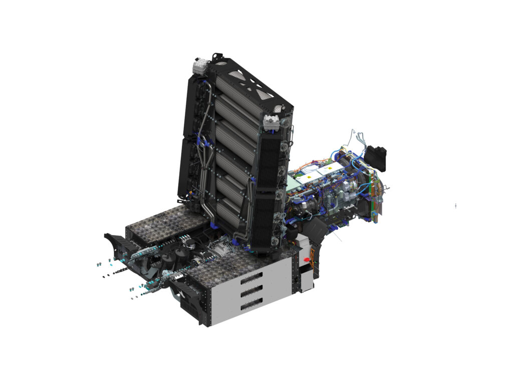 The truck’s batteries can be charged, if required, like any other battery electric vehicle, and a 250–300 kW charging capability exists on the current prototype. The integration of ‘on-the-go’ battery charging is an important functionality, given the limitations on hydrogen refuelling stations, and the charging process follows a typical load curve, with limits for battery protection. Bayerlein says it is safe to charge an electric battery in close proximity to hydrogen storage, but the vehicle only permits it when the fuel cell is not operating.