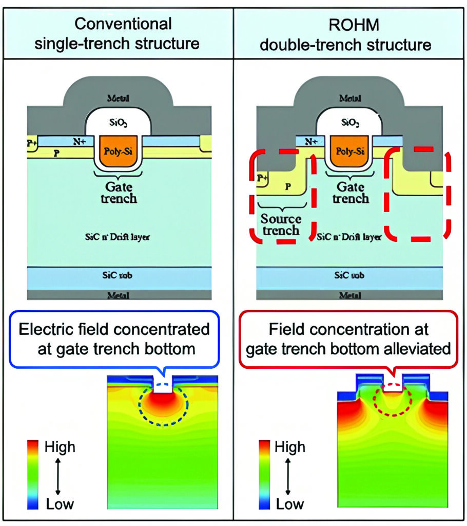 However, in typical single-trench structures, the electric field is concentrated at the bottom of the gate trench, and so long-term reliability has been an issue. In the double-trench structure, a trench structure is provided in the source area as well, meaning that the electric field concentration at the bottom of the gate trench is alleviated and long-term reliability is secured, making possible mass production.